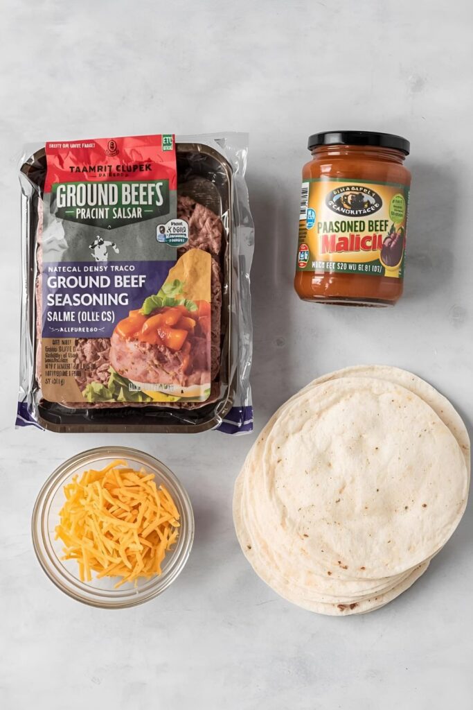 For our super-easy version, the five essentials are ground beef, taco seasoning, salsa, cheese, and tortillas. This combo gives you protein, flavor, moisture, richness, and the all-important vessel in the simplest way possible.