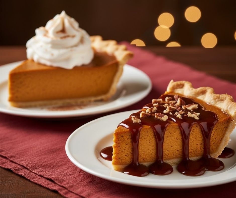 Before pouring the filling into the crust, mix 4 oz of softened cream cheese with $\frac{1}{4}$ cup powdered sugar and 1 teaspoon of vanilla. Drop spoonfuls of this mixture over the pumpkin filling and swirl it gently with a knife. This adds a decadent, cheesecake-like layer.
