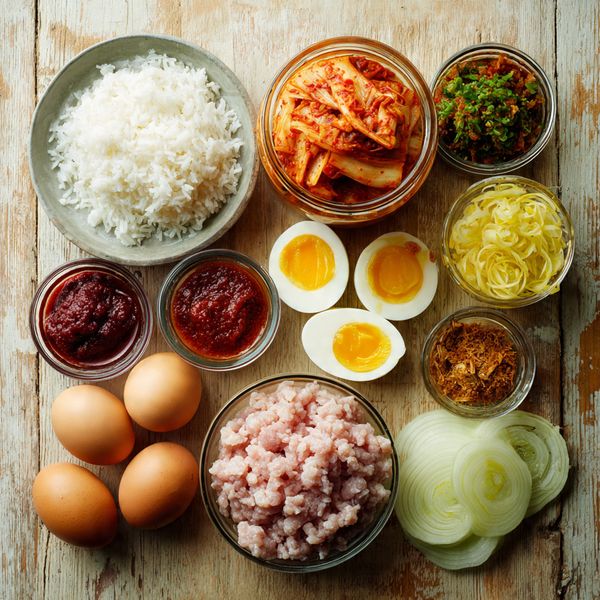 Swap the rice base. Substitute the day-old rice with quinoa or brown rice. Omit the ground meat. Sauté the kimchi, then add cubed tempeh (steamed first) to the pot. Finish with a drizzle of tamari and extra spring onions.