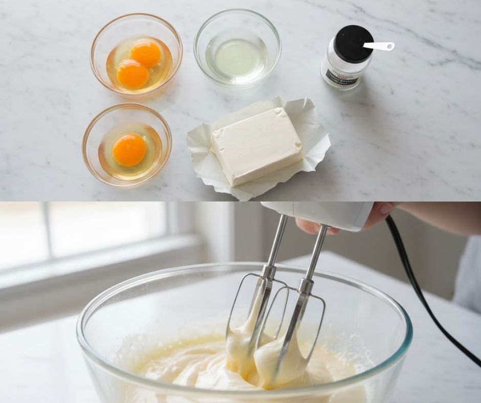 In the second bowl, gently beat the egg yolks, softened cream cheese, and any salt or sweetener you are using. Beat just until completely smooth and lump-free.