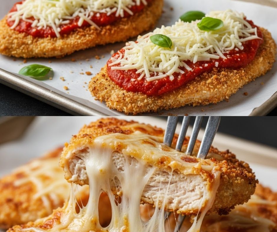 We’re going to create crispy chicken cutlets, smother them in sauce and cheese, then bake them into cheesy perfection.