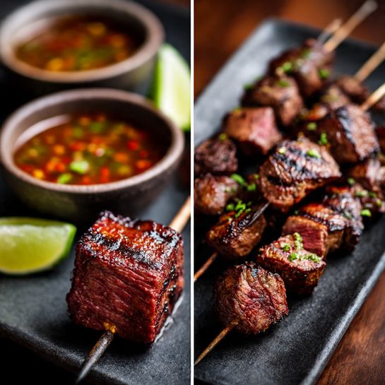 6. Grill Time: Place the skewers on the hot grill. Cook for about 2–3 minutes per side, turning every few minutes until all sides have a nice char and the internal temperature reaches 135°F (57°C) for medium-rare, or 145°F (63°C) for medium. Do not overcook this!