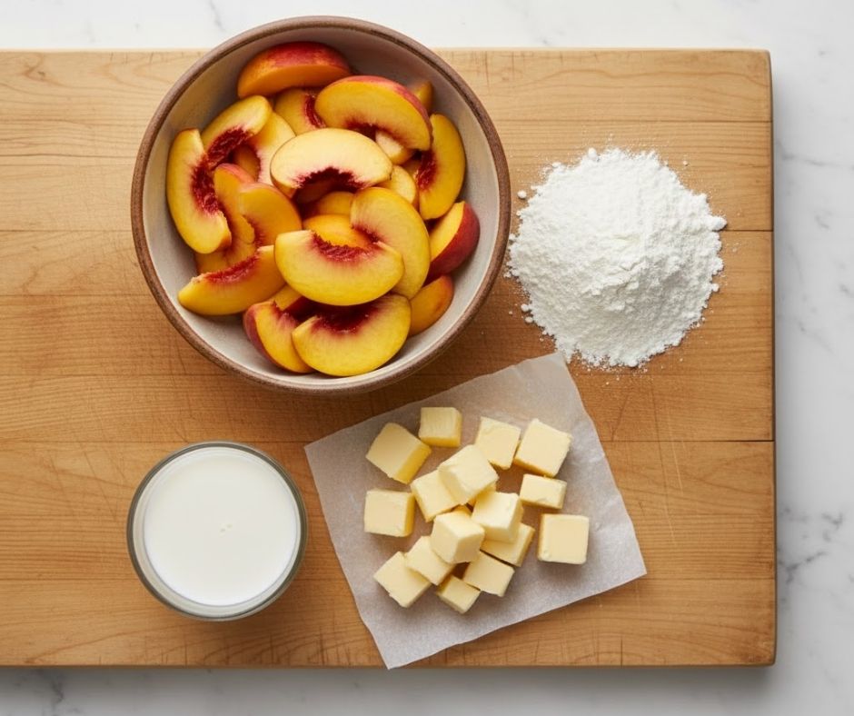 Preheat your oven to 375°F (190°C). Grease your baking dish lightly with butter. Do not peel the peaches if the skins are tender—it adds color and fiber! Slice them into $\frac{1}{2}$-inch thick pieces.