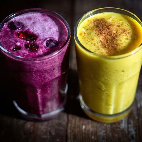 Sneak in your veggies! Add a small handful of baby spinach (it has magnesium!) and replace the cherries with frozen pear slices. The spinach’s color gets totally masked by the other ingredients, so you won’t feel like you’re drinking a swamp thing. TBH, you won’t even taste it.